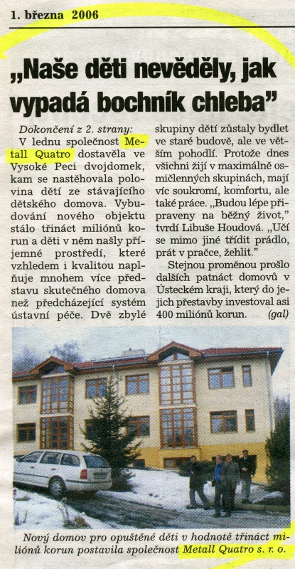 Dětský domov Vysoká Pec - výstavba dvojdomku - 11,5 mil. Kč