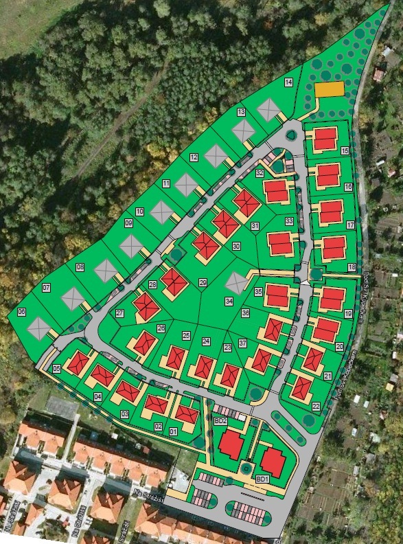 V lokalitě se plánuje 30 rodinných domů a 2 bytové domy v pasivním standardu. Naše firma projektuje 27 nízkoenergetických rodinných domů, z nichž některé mohou být dle přání zákazníků v pasivním standardu. Deset RD postavíme dle individuálních projektů zákazníků. Počítáme s tím, že budeme stavět všechny domy minimálně do úrovně hrubé stavby včetně střechy, oken, tepelné izolace a fasády.